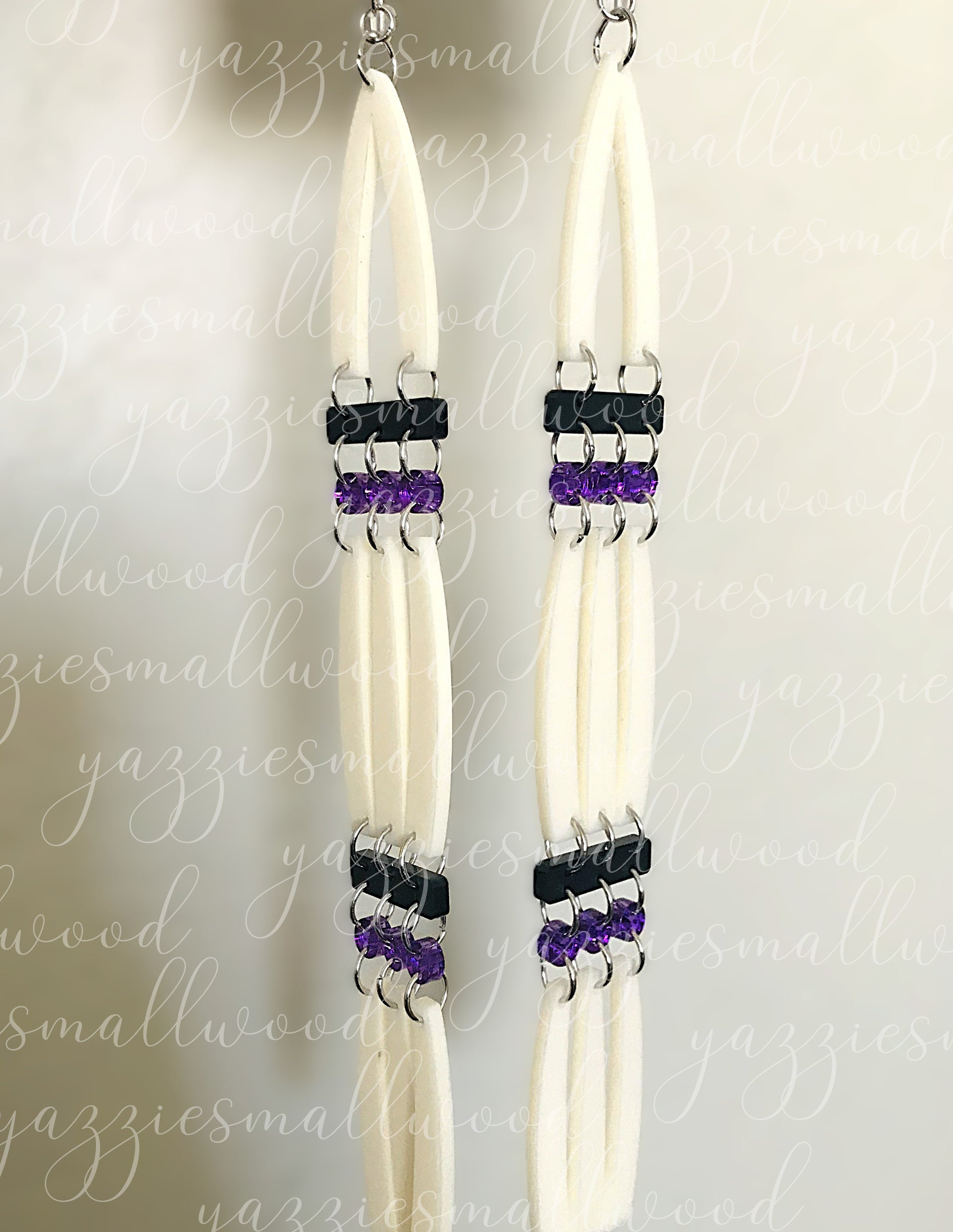 Make a statement with these oversized faux dentalium earrings, designed to celebrate Native American heritage with authenticity and respect. Crafted from warm bone-toned matte/shiny acrylic paired with your choice of vibrant red or purple mirror acrylic faux beads, each pair measures 1.00 inches wide and dangles 9.00 inches long for bold, eye-catching presence. Wear a piece of history. Dentalium shells have been treasured by indigenous peoples for centuries in sacred ceremonies and trade, and these earrings let you honor that meaningful cultural legacy. Lightweight and versatile, these earrings work for any occasion—weddings, graduations, powwows, or everyday style. They feature hypoallergenic, nickel-free fishhook findings with silicone stabilizers to keep them secure. An original yazziesmallwood creation that honors tradition while embracing modern wearable art. Packaged in a clear protective sleeve with reinforced cardstock backing to maintain structural integrity and visual quality throughout the shipping process.