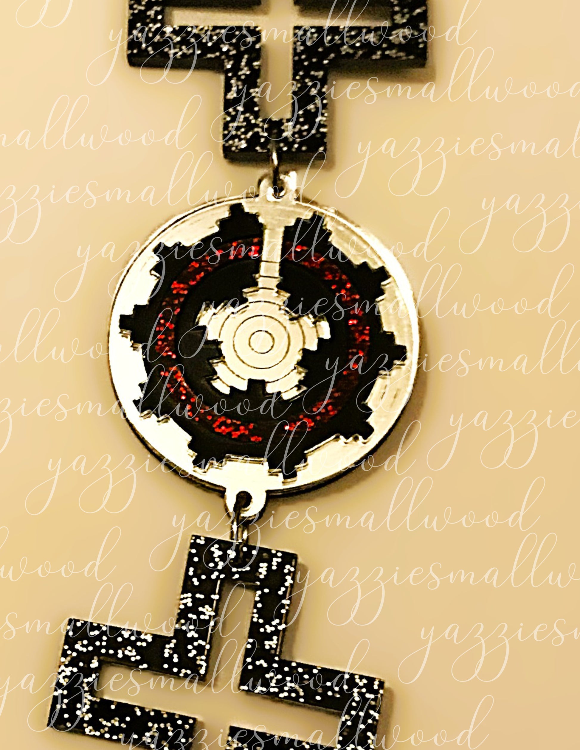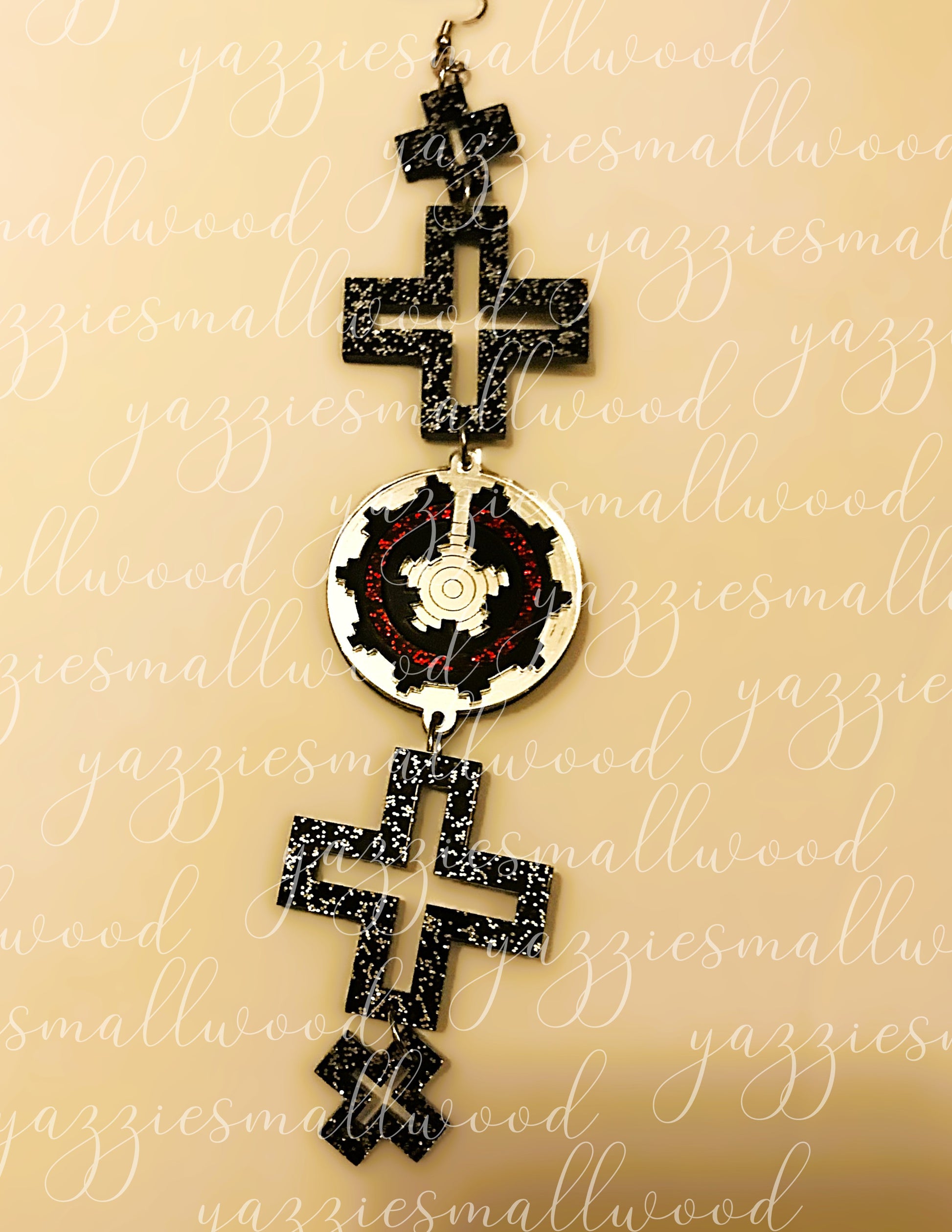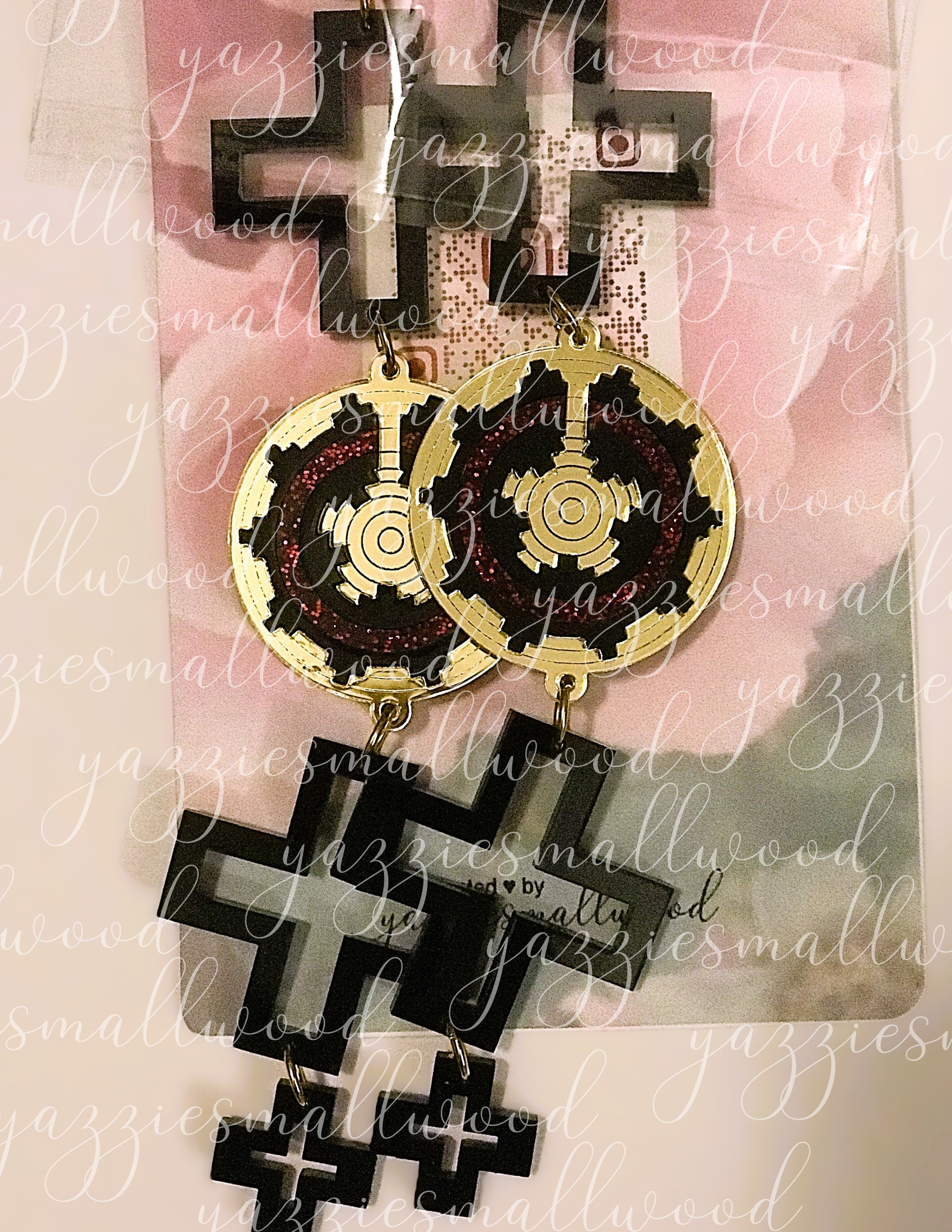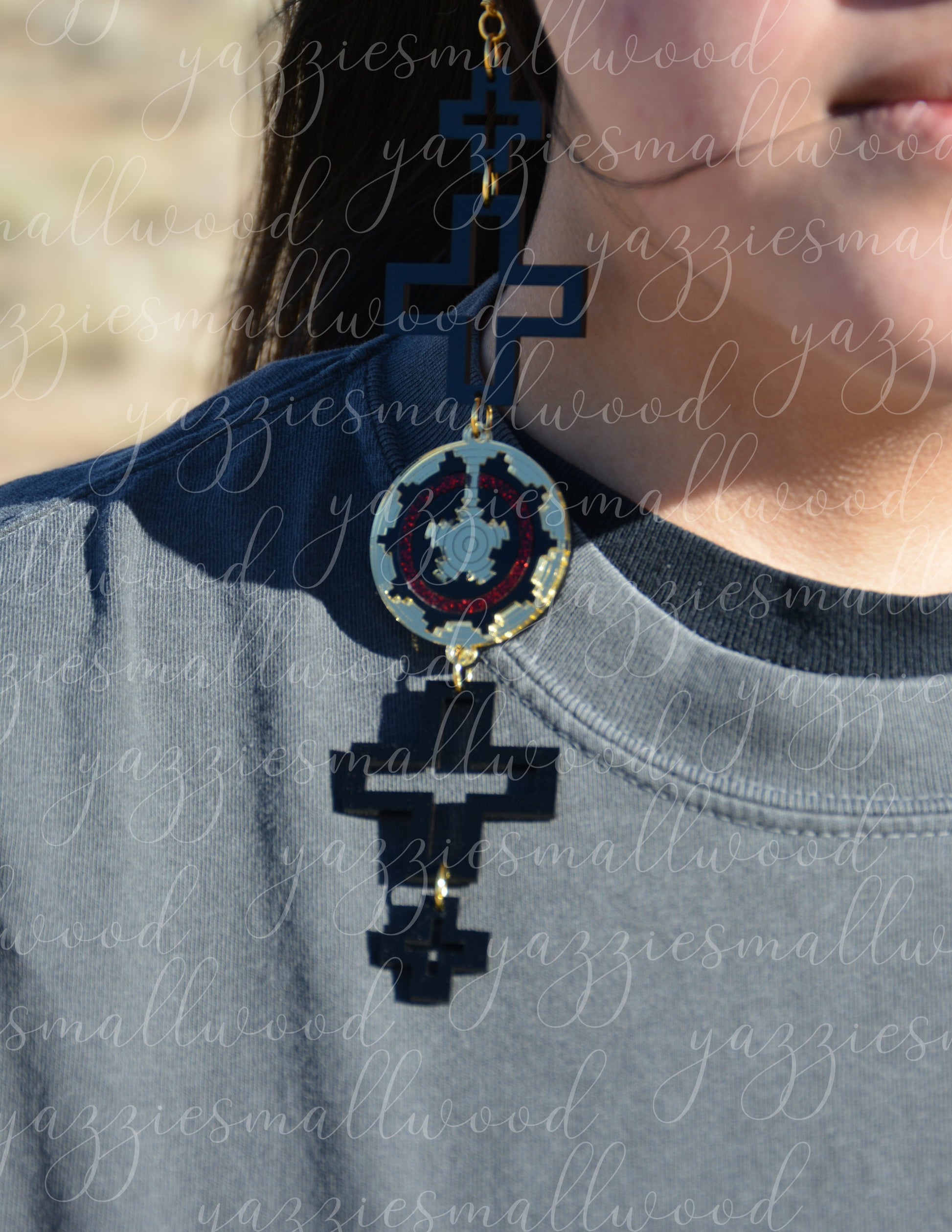 Honor your roots with these magnificent XL Glittering World Earrings, showcasing an elaborate ceremonial basket motif framed by the revered Spider Woman Cross. These beautifully crafted pieces reflect the rich legacy of southwest Native American artistry, drawing inspiration from traditional weaving and textile work. Available in gleaming gold or silver mirror acrylic with intricate laser-cut precision, they command attention at 1.5 inches wide and 8 inches long while staying light and comfortable. Featuring hypoallergenic, nickel-free fishhook findings with silicone stabilizers, you can wear them confidently all day long—from cultural gatherings to everyday moments. An original yazziesmallwood design that merges timeless cultural expression with contemporary wearable art. Each pair arrives beautifully presented, perfect for gifting or keeping as your own treasured accessory.