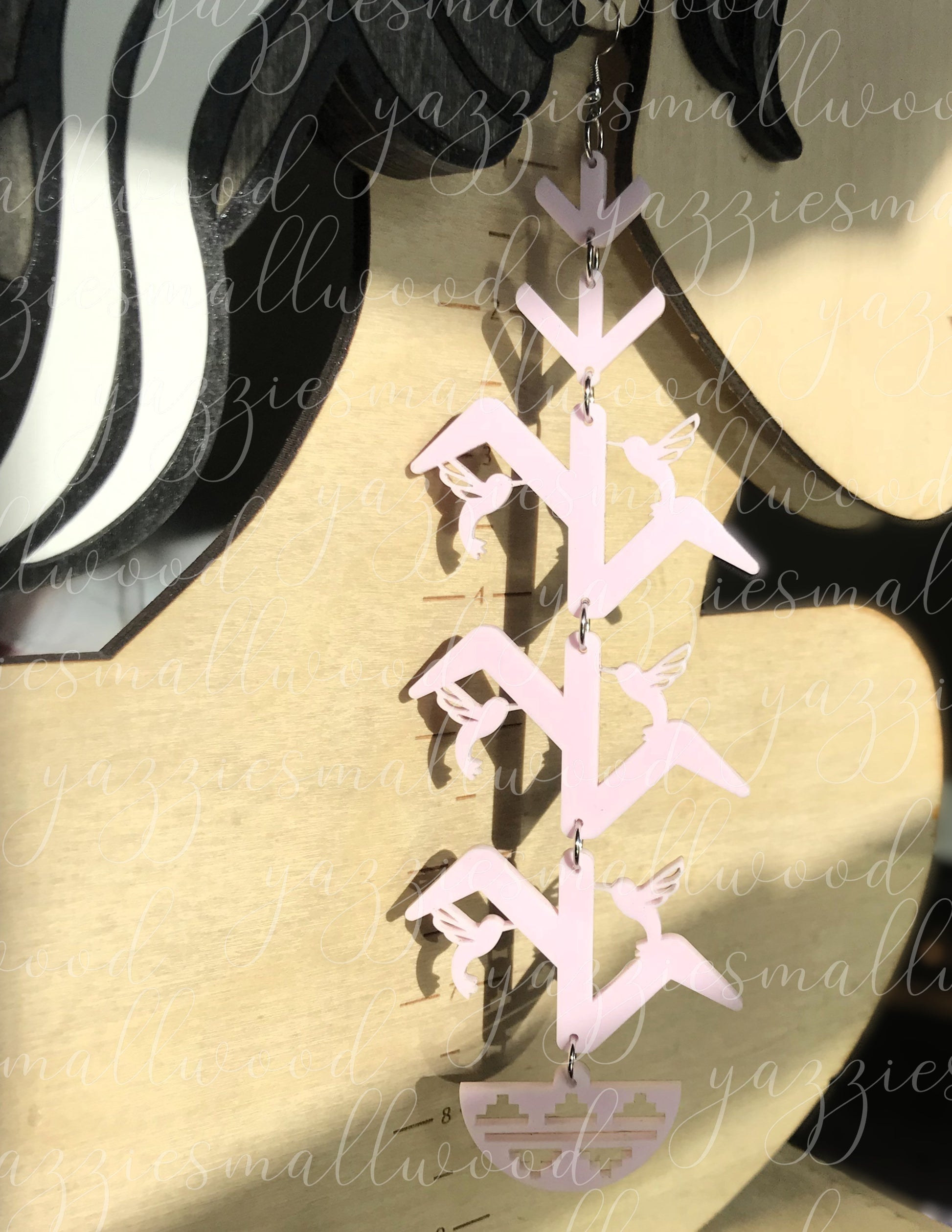 Inspired by traditional southwest native basket and rug weaving artistry, these striking XL earrings feature a Hummingbird and Tree of Life design that celebrates growth, balance, and cultural heritage. Crafted from lightweight tiered acrylic with precision laser-cut details, they make a powerful statement without weighing you down—perfect for powwows, celebrations, or everyday wear that honors your identity. The 8-inch by 2.5-inch design showcases intricate ancestral patterns in contemporary form. Secure nickel-free fishhooks and silicone stabilizers ensure all-day comfort and stability. This original patent-pending piece arrives beautifully packaged, ready to complement your colorful ribbon skirts and become a treasured part of your collection.